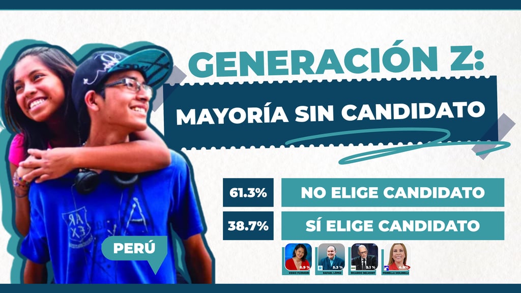 Entre los candidatos que sí son conocidos entre la juventud, Keiko Fujimori alcanza la mayor votación con apenas 6.9%; seguida por Rafael López Aliaga con 5.3%, Ricardo Belmont con 5.1% y Fiorella Molnelli con 4.8%. Cifras muy bajas que podrían reflejar indecisión o desconocimiento.